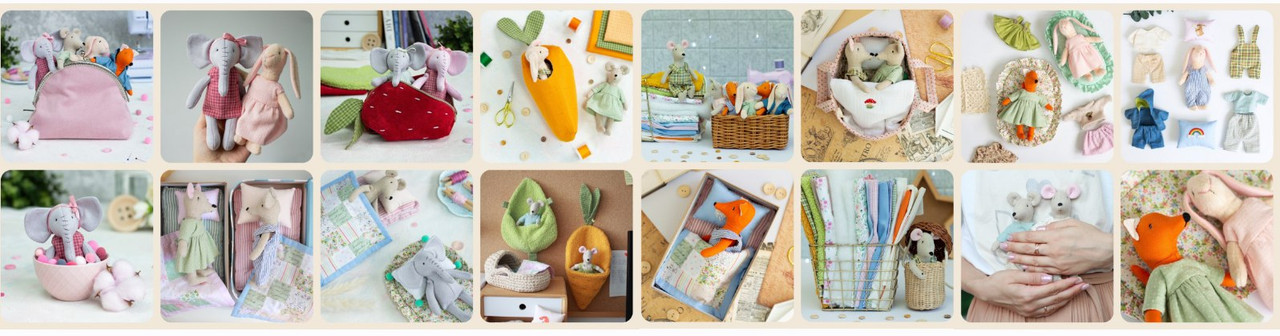 • сошьете очаровательную семейку забавных мышат, зайчат, лисят, оленят, слонят, гусят и лягушат